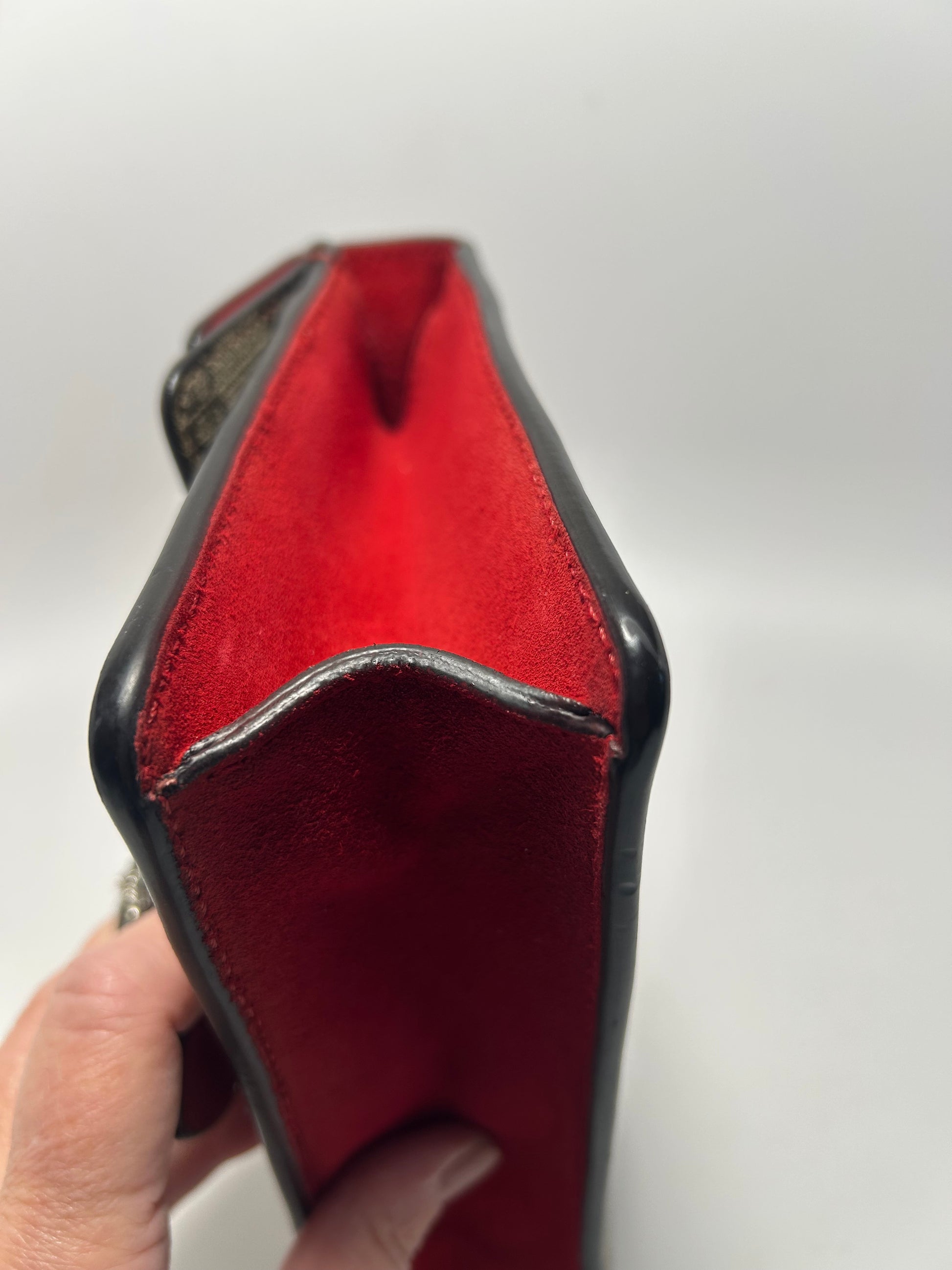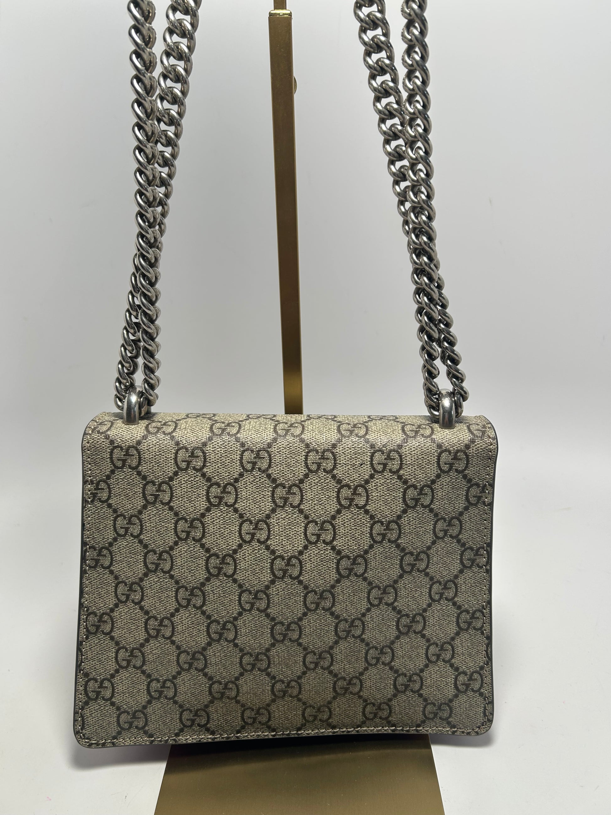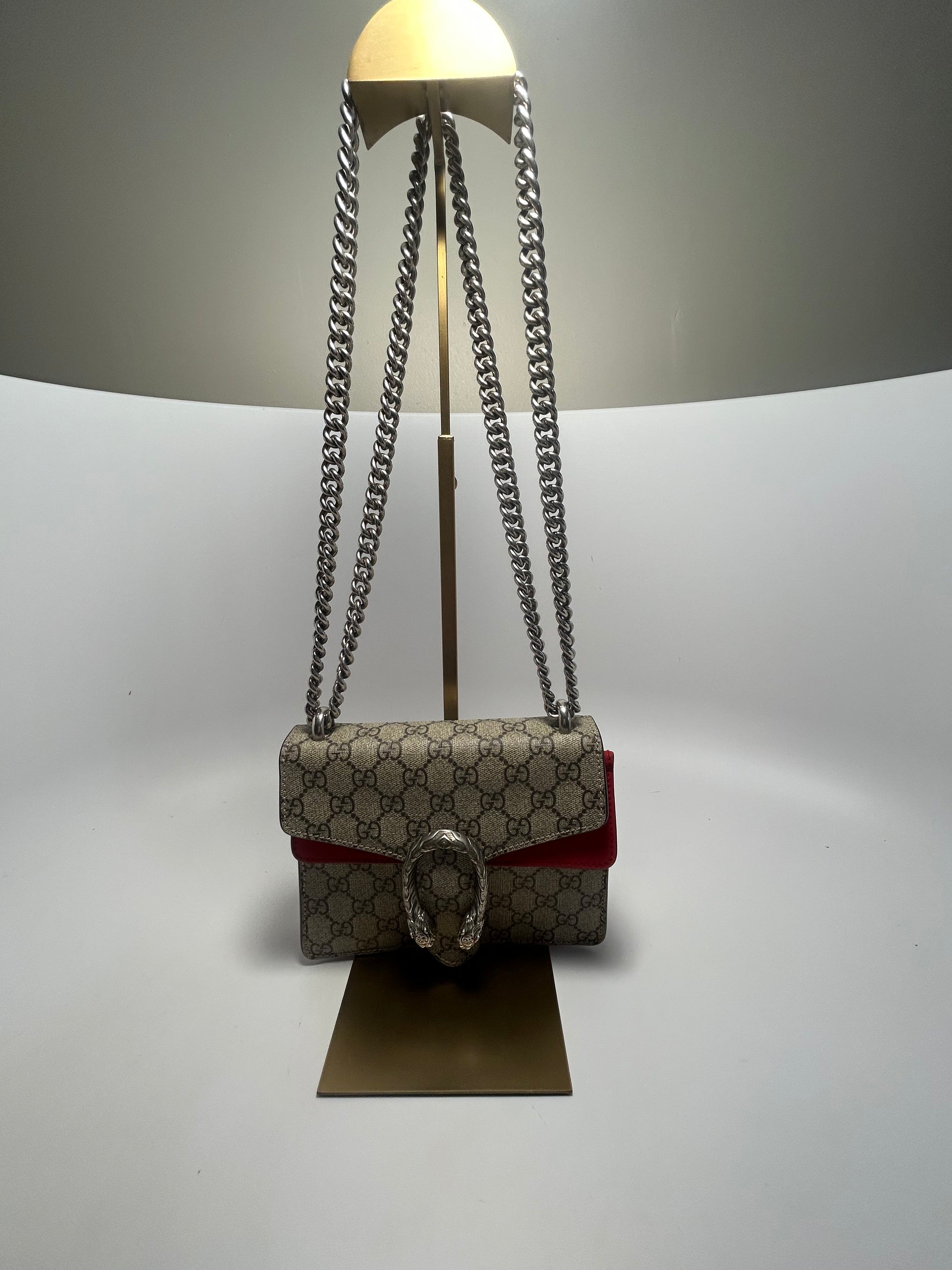 The Gucci GG Supreme Dionysus Mini Shoulder Bag combines timeless design with expert craftsmanship. Crafted from the signature GG Supreme canvas, this compact bag measures 7.5" wide by 6" high and 2" deep, and features a striking red interior that adds a bold contrast. The adjustable chain strap allows for versatile shoulder or crossbody wear, while the distinctive Only flaw I see is tiny mark on the back (pictured in last photo). Dionysus hardware elevates its sophisticated appeal. Ideal for those seeking a refined yet practical accessory, this bag seamlessly blends luxury with everyday functionality.