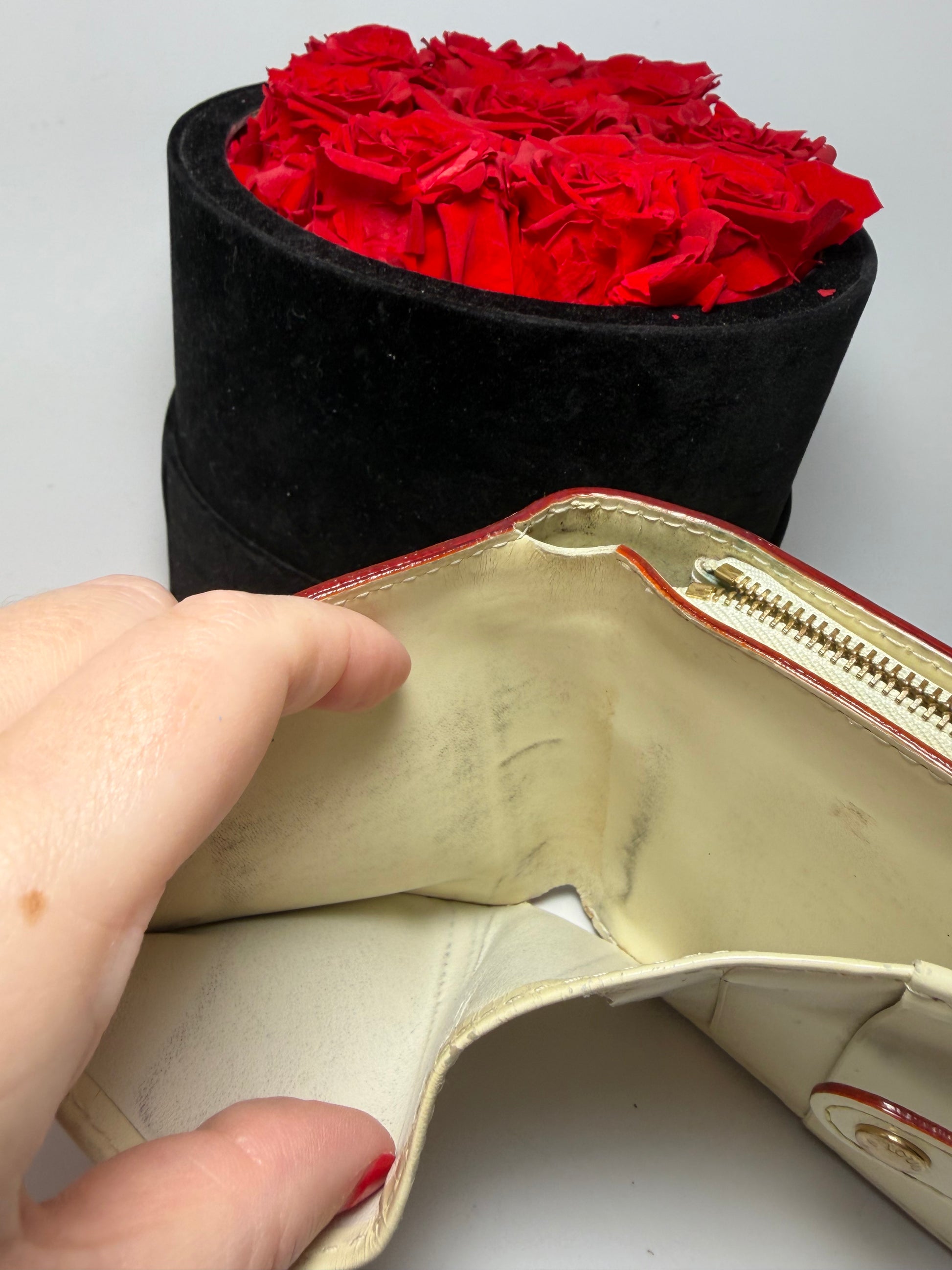 Fair condition. Has multiple marks in interior and color transfer in some spots on exterior. Zipper coin pocket. No odor.