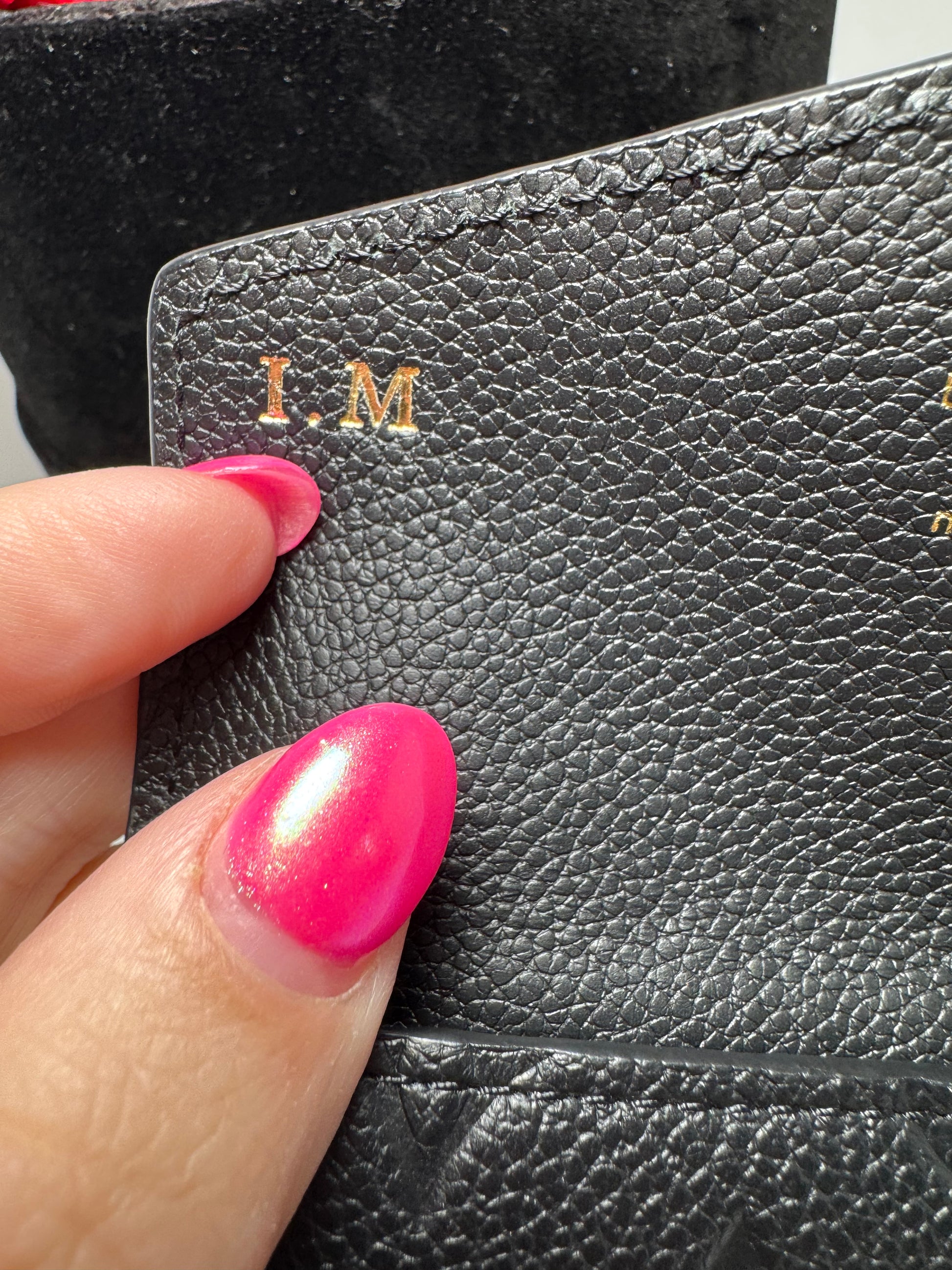 Excellent condition. Only flaw I see is tiny scratch on the button (pictured). No other flaw or wear. No corner wear. No odor. Has initials “I.M.” Stamped inside under flap.