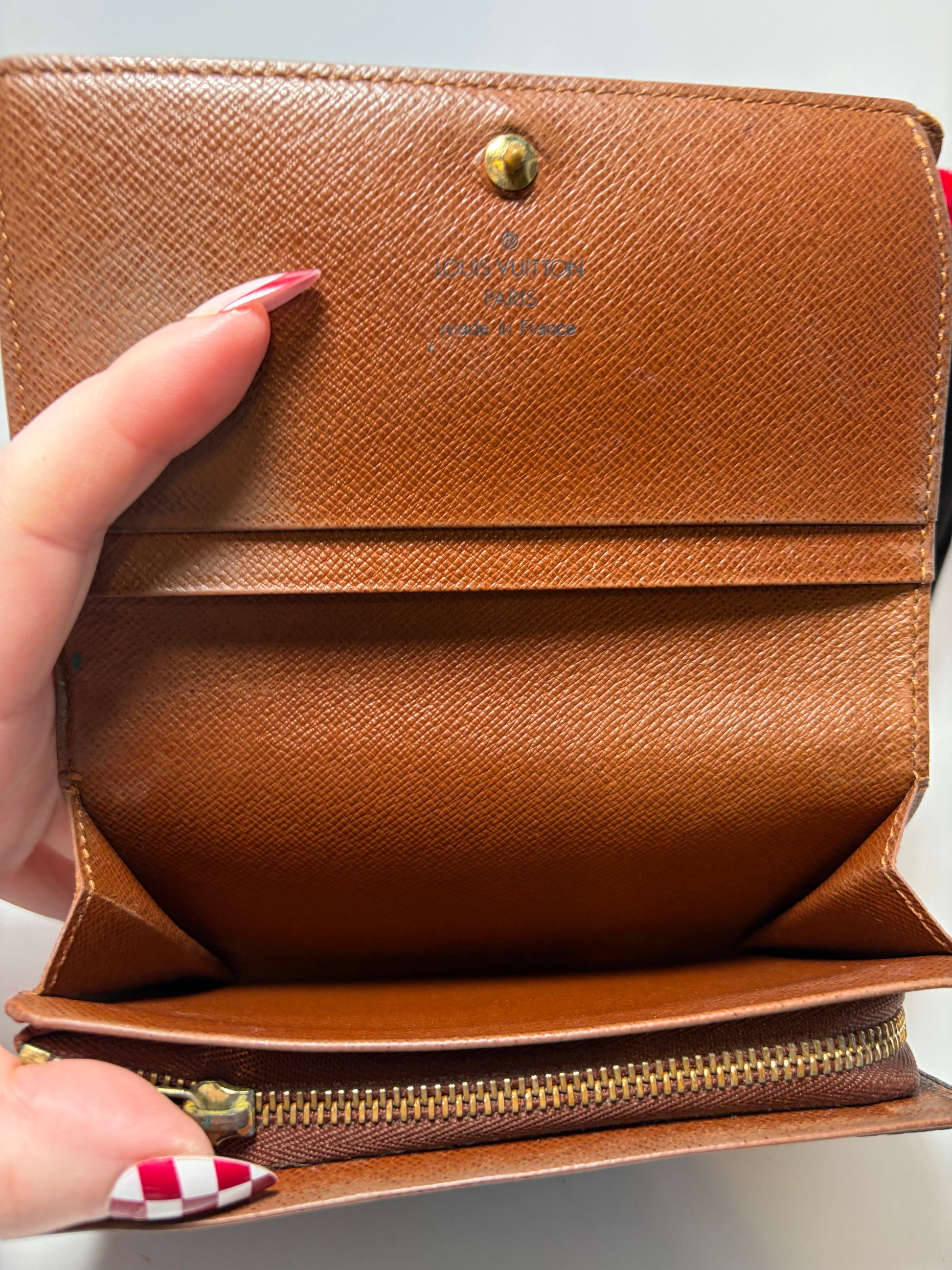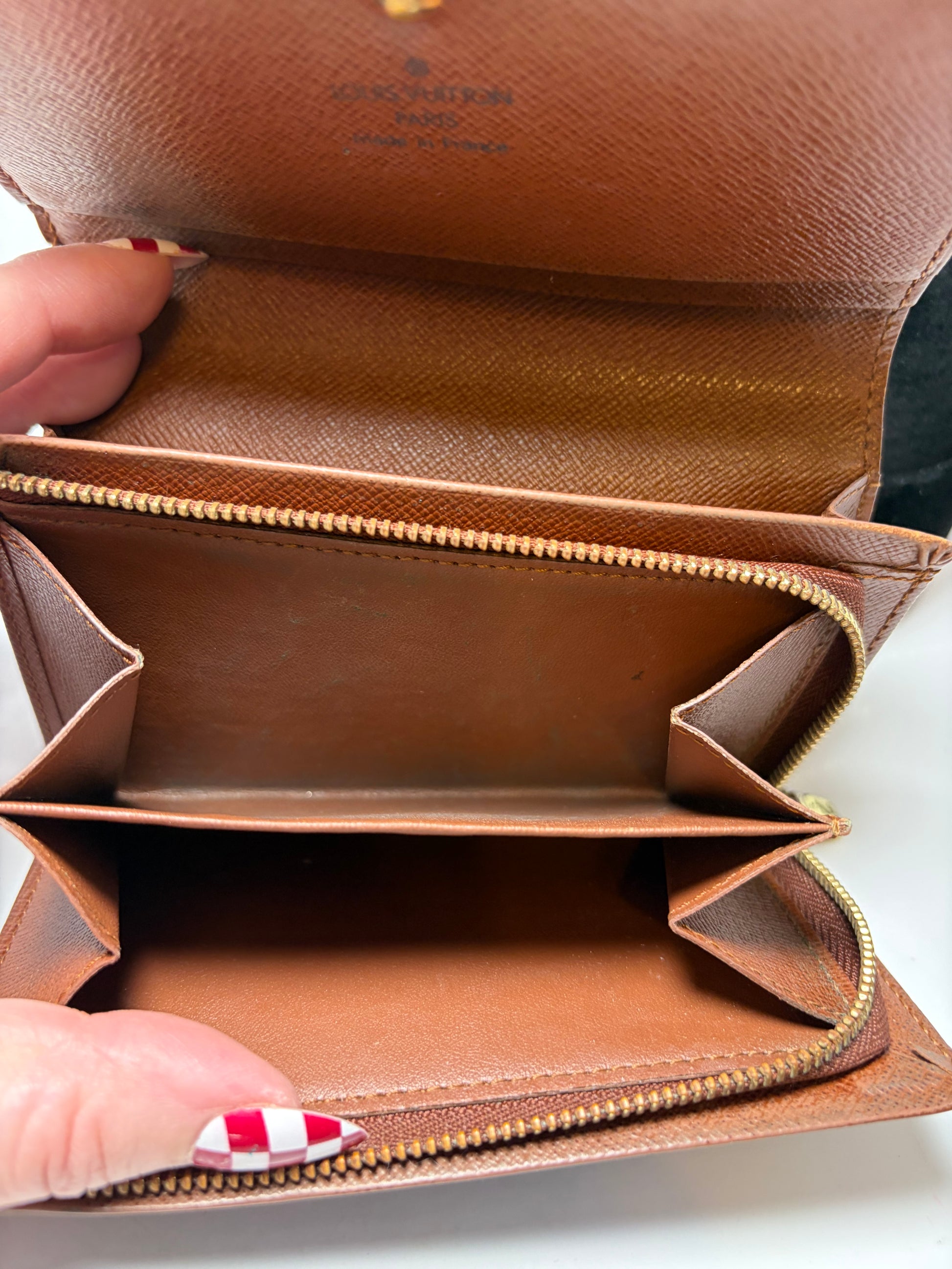 Good condition. Snap is secure. Has small mark on exterior (last photo). Zipper works well. Zipper pouch for coins, multiple slots for credit cards.