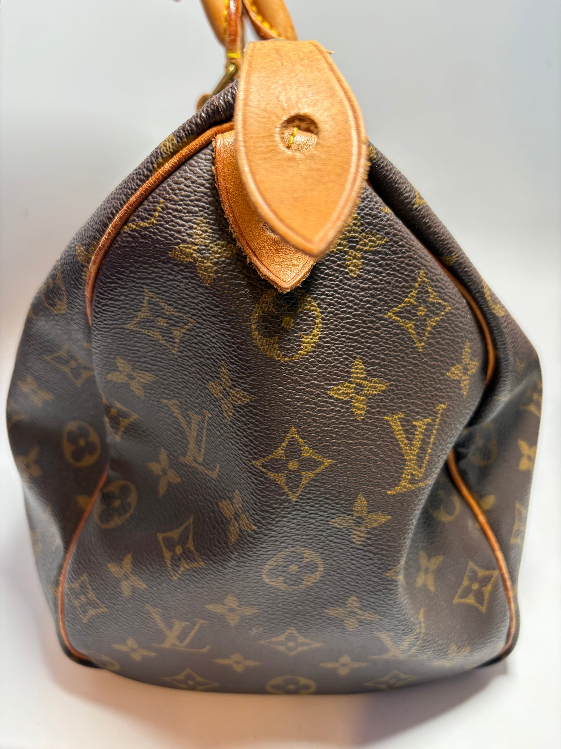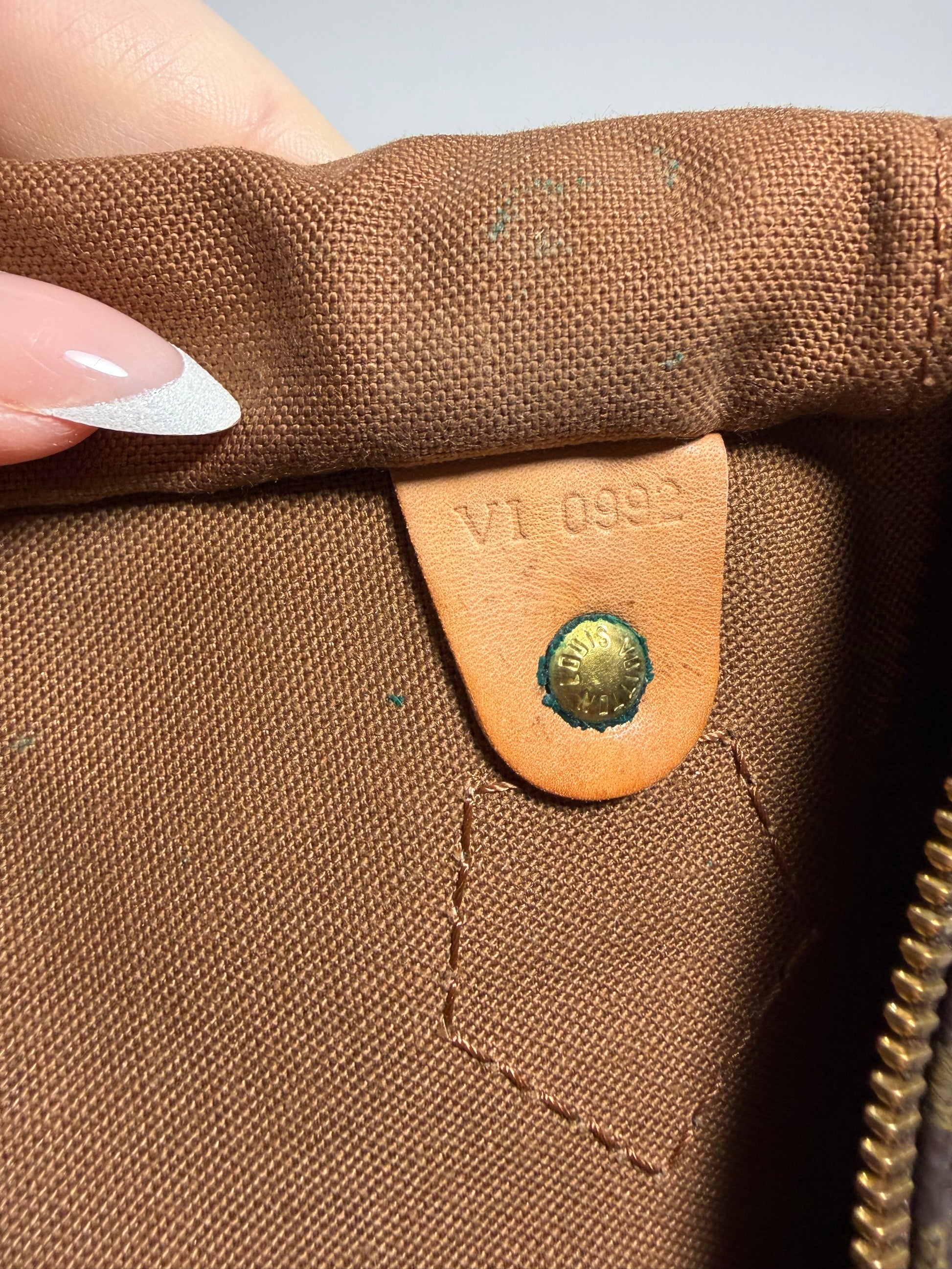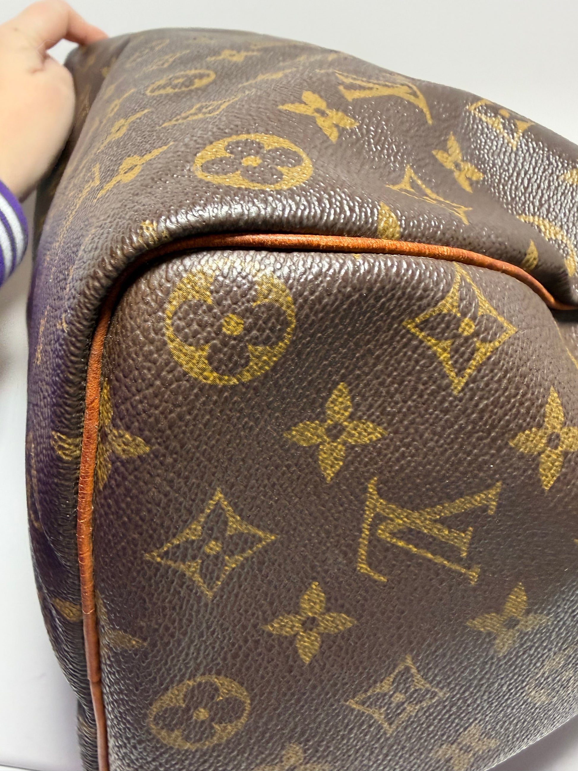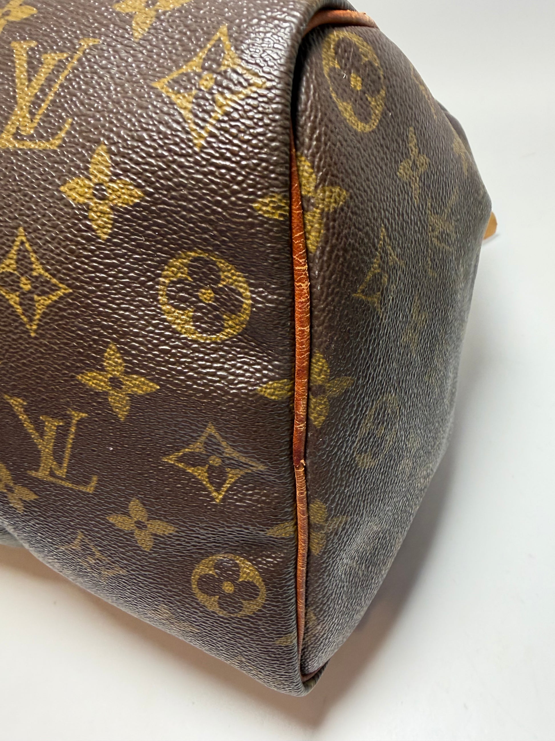 Speedy 35 in monogram. No cracks or tears in the canvas. Interior is clean, no odor. Handles in very good condition. Has beautiful patina. Zipper pull in good condition. Some surface cracks in the leather piping on the bottom (pictured)