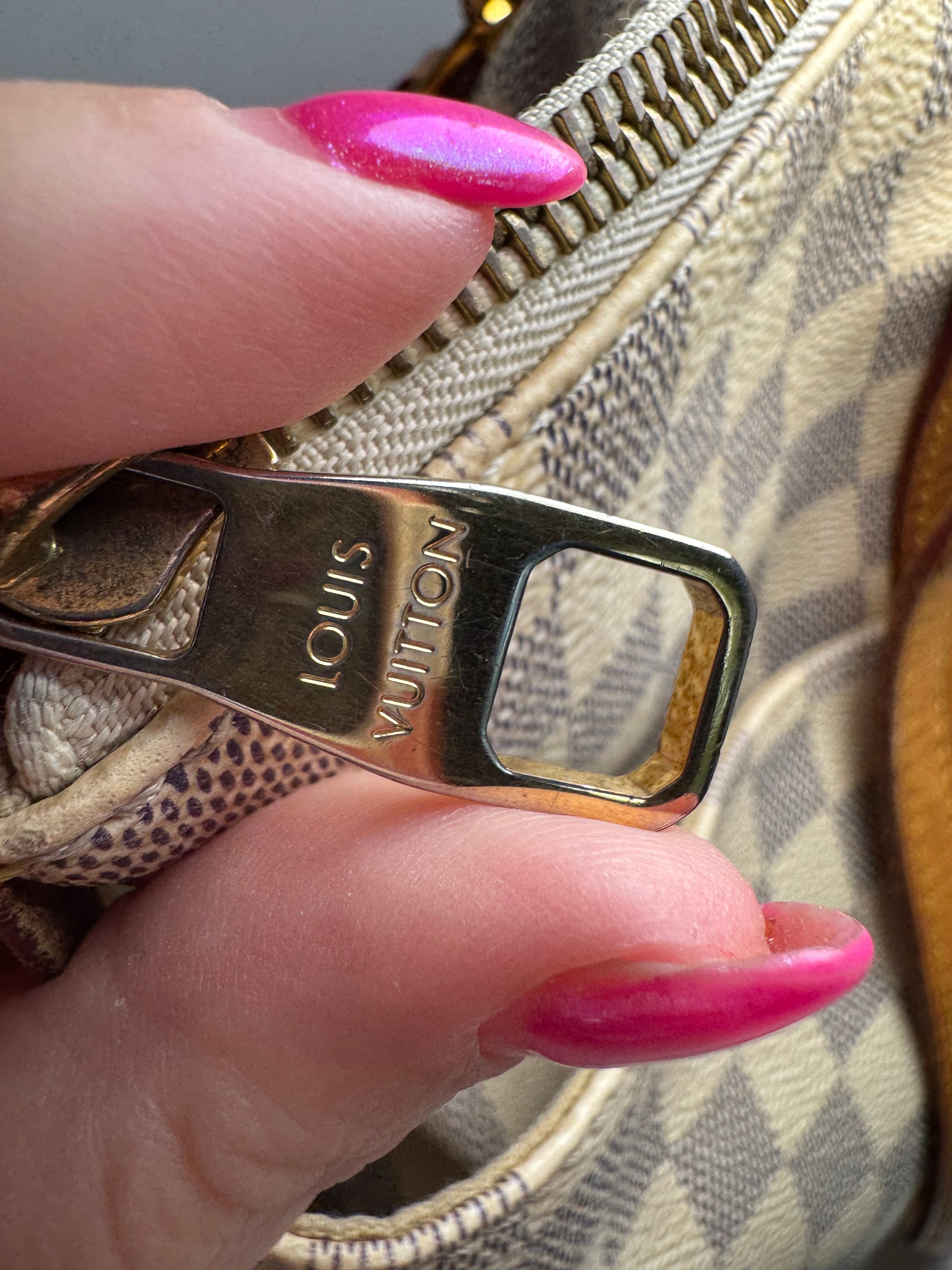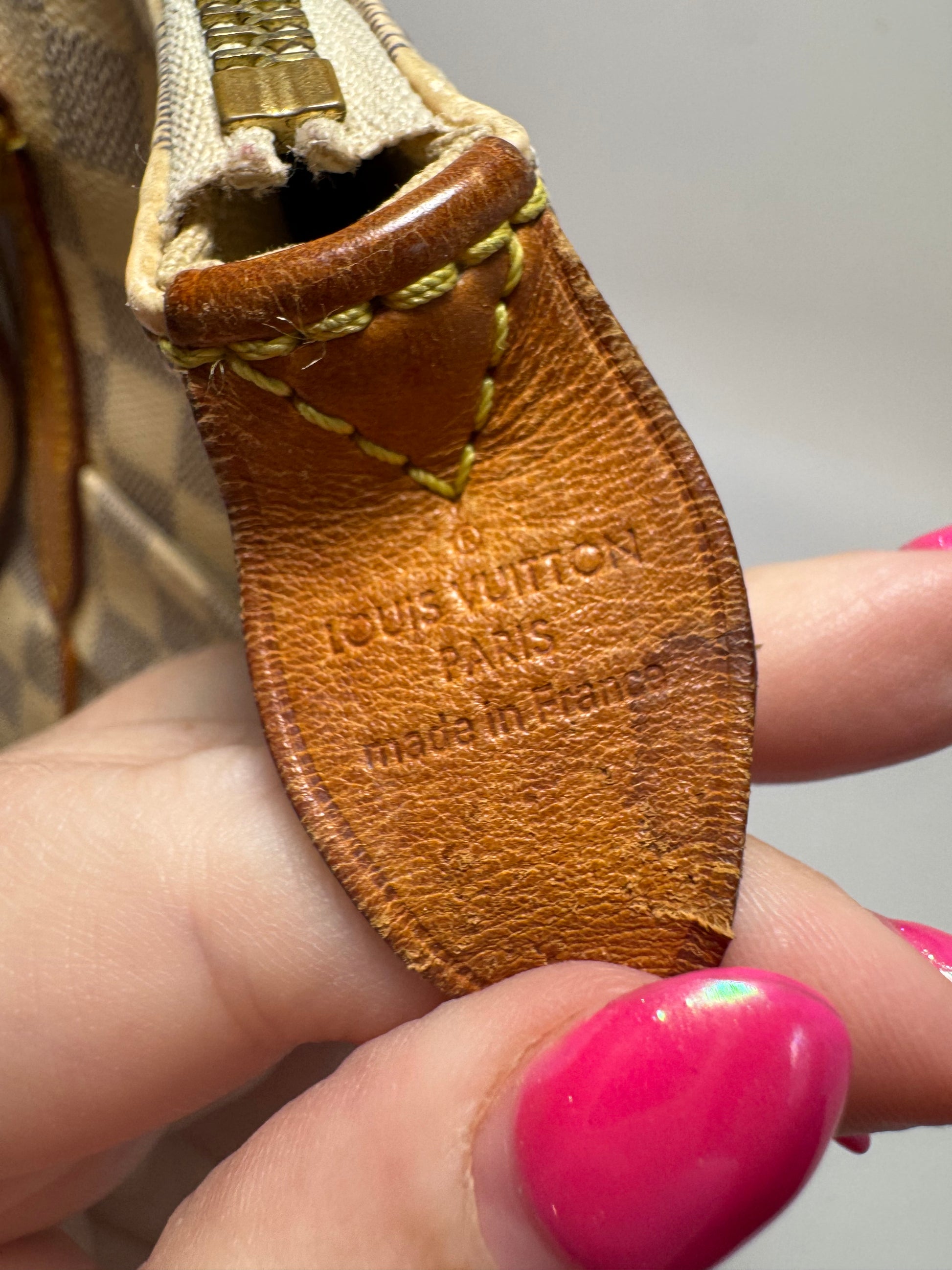 Very good condition! Clean interior, only stain I see is small pen mark in interior (pictured). Zipper works great. No yellowing or cracks in canvas. No major corner rubs or wear. Some darkening on the Vachetta. Straps are still in great condition.