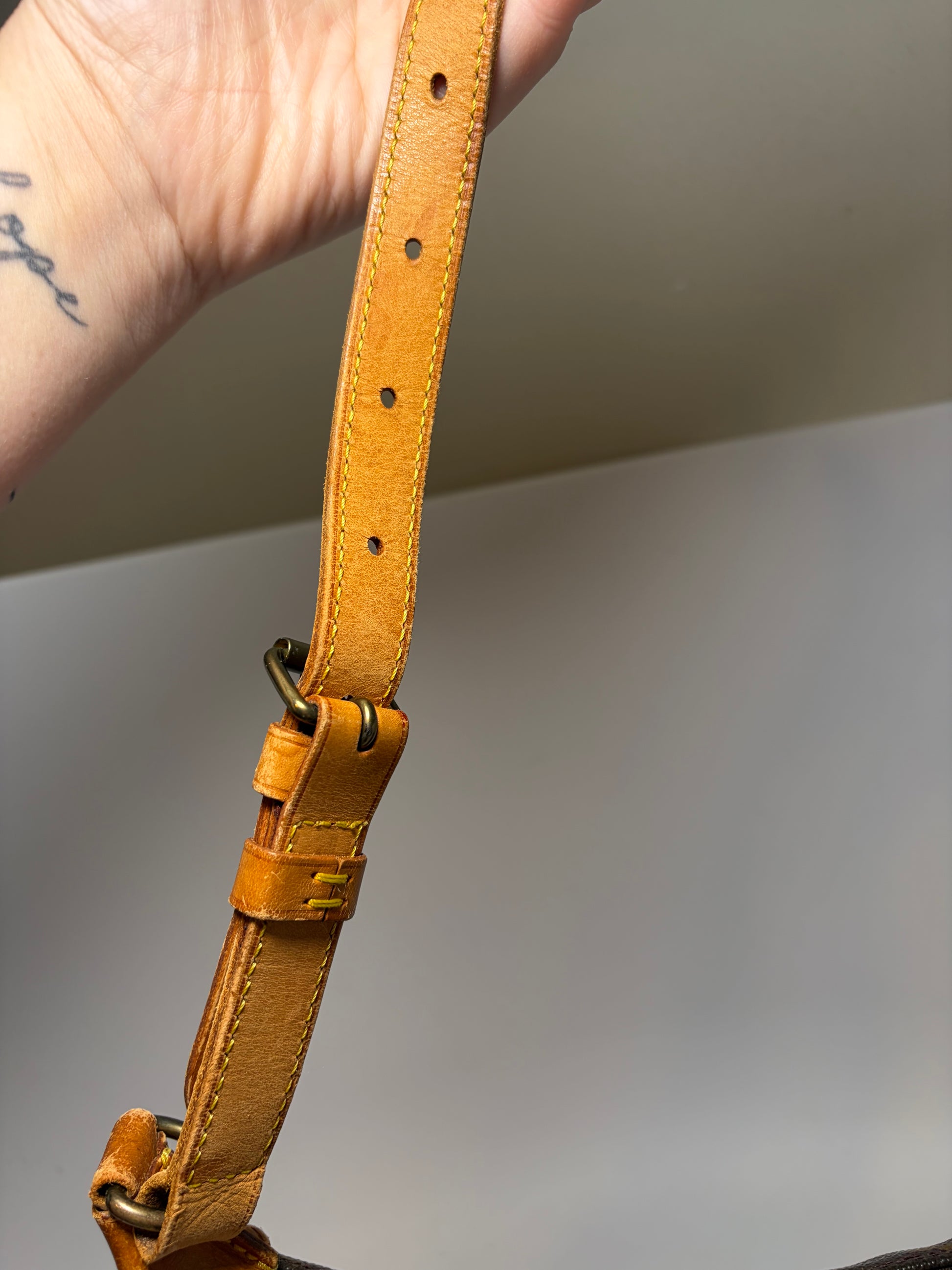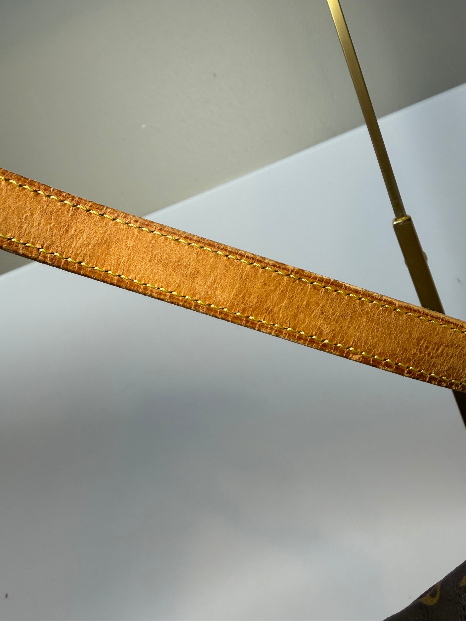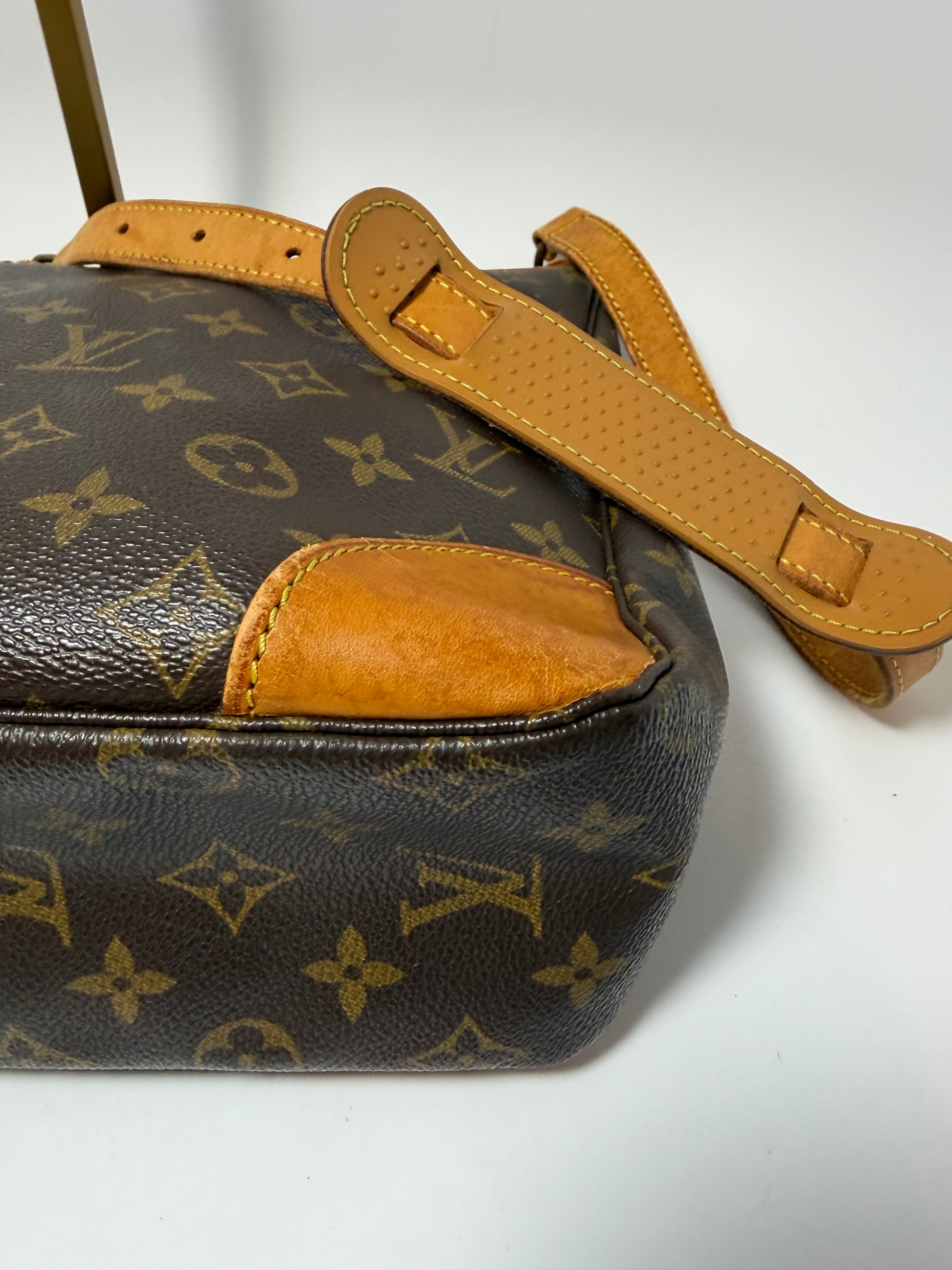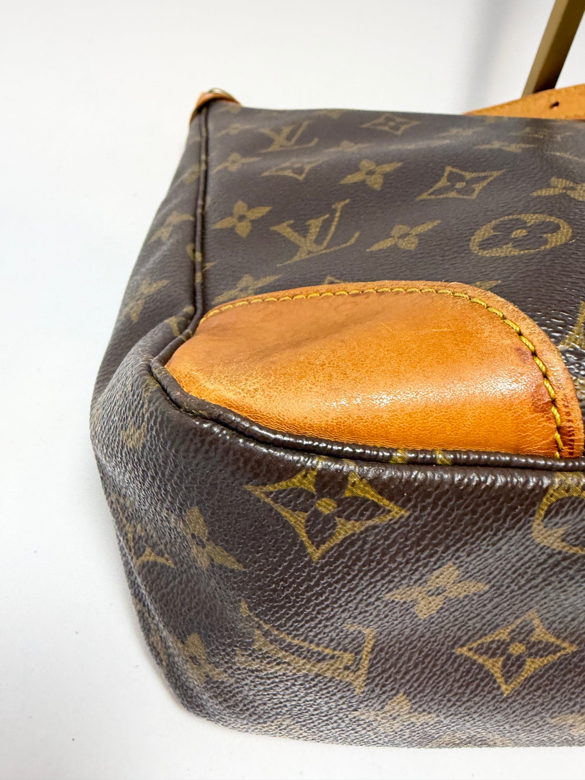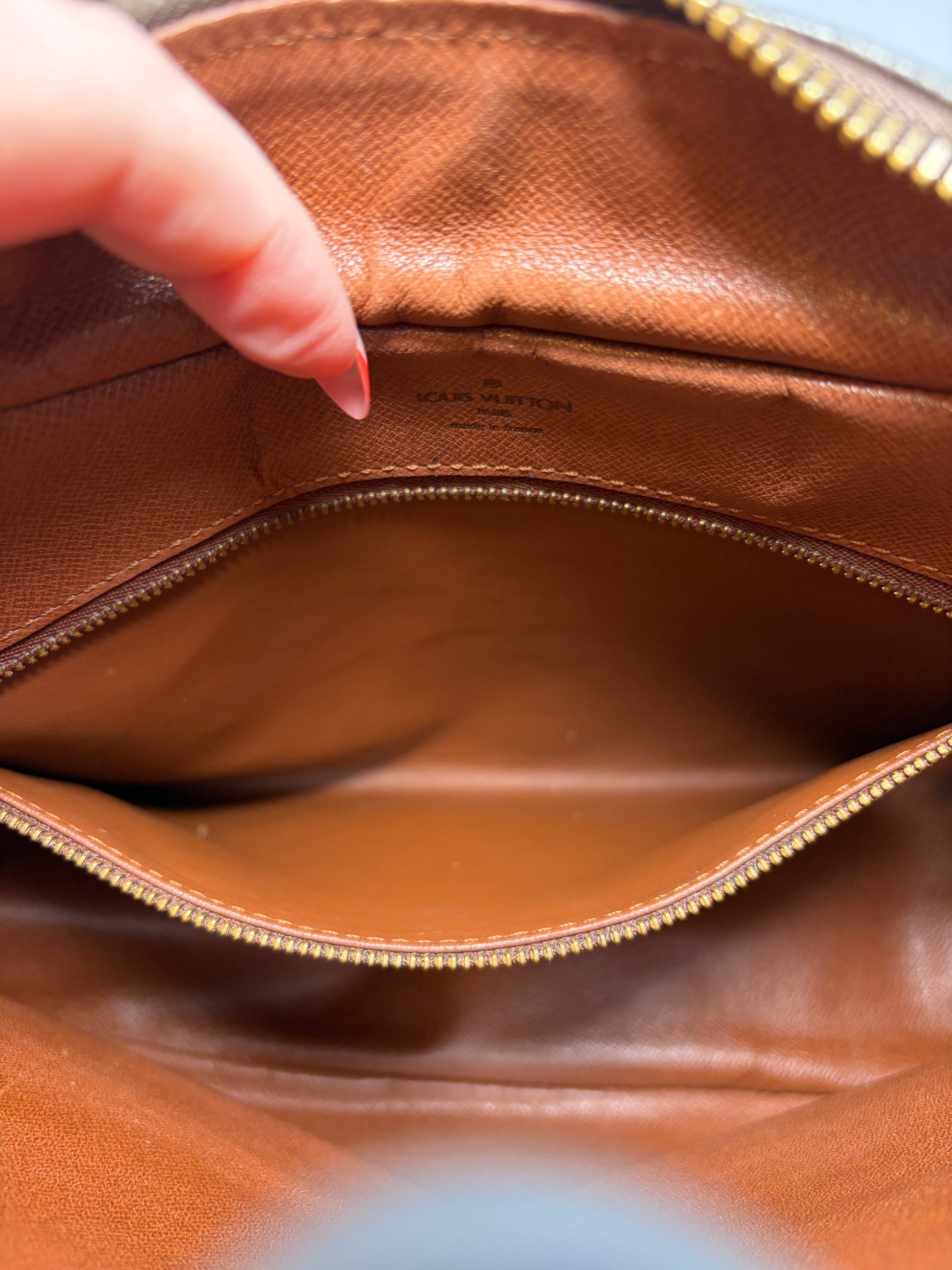Good condition. No cracks or tears in the canvas. Vachetta leather is in good shape with beautiful patina. Clean interior with no peeling or stickiness. Zipper works great- a little bit of tarnishing on the zipper (pictured).